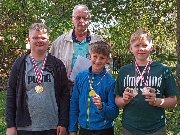 Die Jungschützen Manuel Montag, Bela Max Keller und Henrik Rosenau mit ihrem Trainer Gerald Keller